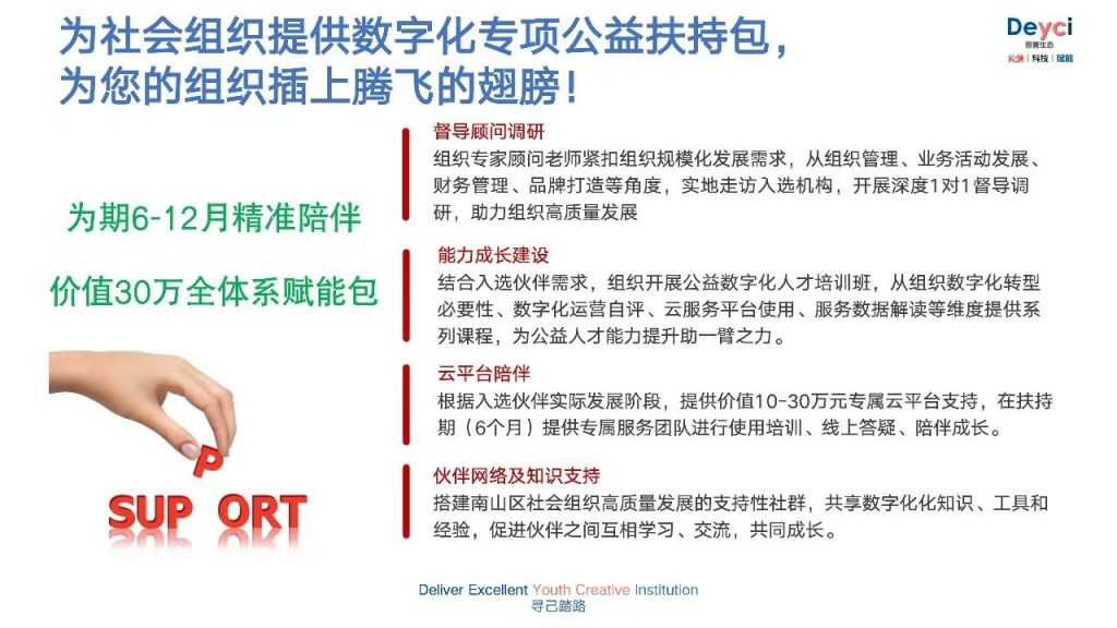 • 合作机制:携手行业精英,共同推动数字赋能计划的深入实施!加入Deyci数字赋能计划,让我们用专业力量,重塑公益未来,开启社会组织新篇章!
