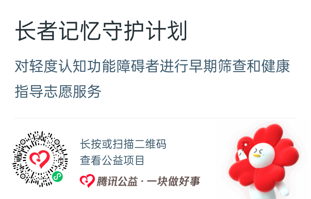 如果您认可我们的项目理念,也想为我们的项目给予一份力量,您可通过扫描上方的二维码,为项目给予一个支持!您的帮助将使认知症疾病的预防,多一份希望,多一份力量,多一份辉煌!