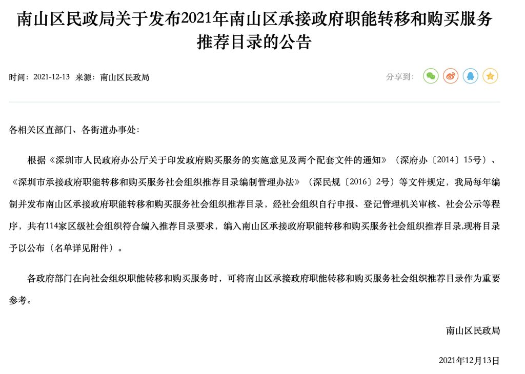 二、入选2021年南山区承接政府职能转移和购买服务社会组织推荐目录公示名单